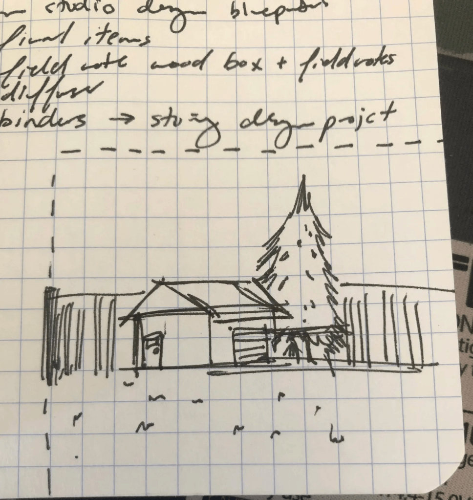 One thing I wanted to add was a mini-remote facility on the edge of the Lab, I got the idea one day during a roadtrip with family, I would see tiny facilities housed around by a metal fence, a small driveway for 1-2 vehicles, patch of grass, tiny trees and a small building that looks like a design team would go to everyday to do their work. I made a tiny sketch of what it could like if I gradually get to building the Lab: